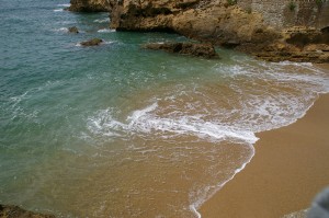 Dimanche, quoi qu’il arrive, on avait décidé d’aller à la plage, j’y tenais particulièrement : j’y suis pas allée, cette année. On prend la voiture, le temps est mitigé. Plus on s’approche de la plage, plus le ciel est couvert. Tiens, les voitures en face ont les phares allumés… Tiens, ils ont les essuie-glace, aussi. Merde, il pleut. C’est pas grave, c’est pas ça qui va nous arrêter ! Bon, il flotte mais on commence quand même à longer la plage mais à peine arrivés, le temps se lève et là, tous les gens réfugiés dans les crêperies alentour débarquent mais contrairement aux plages méditerranéennes, on se marche pas dessus. J’avais promis à Olivier que je tremperai les pieds dans l’océan et vu que le soleil est revenu, je me lance. J’enlève mes bottes, mes bas, je remonte mon pantalon et j’y vais, armée de mon portable pour prendre une preuve de mon barbotage. Sauf que moi, je suis une fille de la Méditerranée donc pendant que j’essaie de photographier mes pieds, je fais pas attention aux vagues et je me retrouve avec de l’eau jusqu’aux cuisses sans trop comprendre ! Il n’empêche que l’eau est délicieuse et je regrette soudain de pas avoir pris mon maillot, j’ai très envie de me baigner. Mais mon string minimaliste ne peut pas faire office de maillot, pas plus que mon sous-tif certes très joli mais une fois trempé risque d’être tout transparent. Enfin, certains n’ont pas ma pudeur vu qu’on a vu passer un mec à poil courant joyeusement dans les vagues. Je sais pas pourquoi, mais un mec courant à poil a toujours un côté ridicule, avec son pénis qui ballotte.