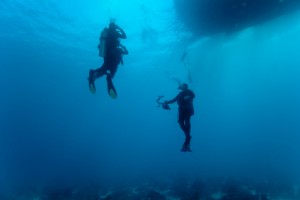 Mes joues commencent à avoir froid, la lumière bleue disparaît, tout devient ocre, mon masque commence à écraser sérieusement mon nez. Je souffle dans mon masque pour le gonfler et je continue la descente pour dire bonjour aux plongeurs.