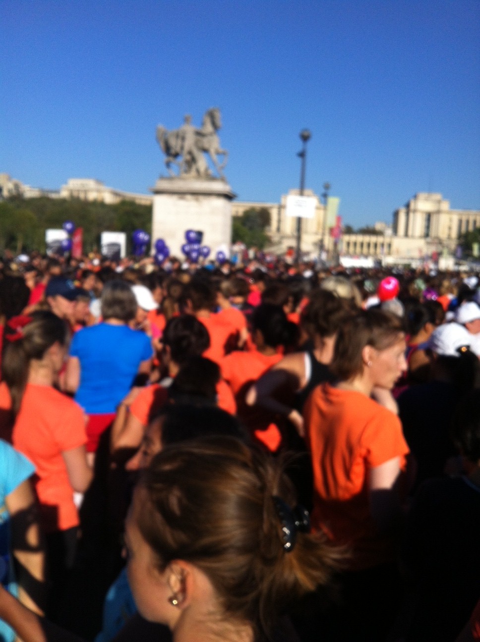 Dimanche, rendez-vous à 8h. Donc un lever à 7h, pouf… Pour un dimanche, ça pique. On fait partie d’une équipe montée par Marine brune, une des participantes du voyage en Thaïlande. Avec Anaïs, on a relevé le défi, se disant que c’était pour la bonne cause puis si on peut marcher alors c’est super ! Le temps qu’on récupère tout le monde, qu’on pose les sacs aux consignes, que quelques pipis soient faits, on se retrouve joyeusement sur le pont d’Iena où se situe la ligne de départ. Celle-ci est juste de l’autre côté du pont, nous au début. Entre le départ et nous, des milliers de filles. Gloups !