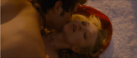 Tout commence dans une forêt où une jolie fille en cape rouge batifole avec un garçon à la coiffure impeccable. Oui, dans la forêt, il semble y avoir du Vivelle Dop. La fille veut fuir avec le garçon bien coiffé, un poil gothique… Ah oui, j’ai omis un détail, ce film est réalisé par la nana qui vous a gratifié des Twilight. Voilà, voilà. Donc un garçon un peu sombre et sauvage, une fille fraîche et innocente, on retrouve nos basiques.