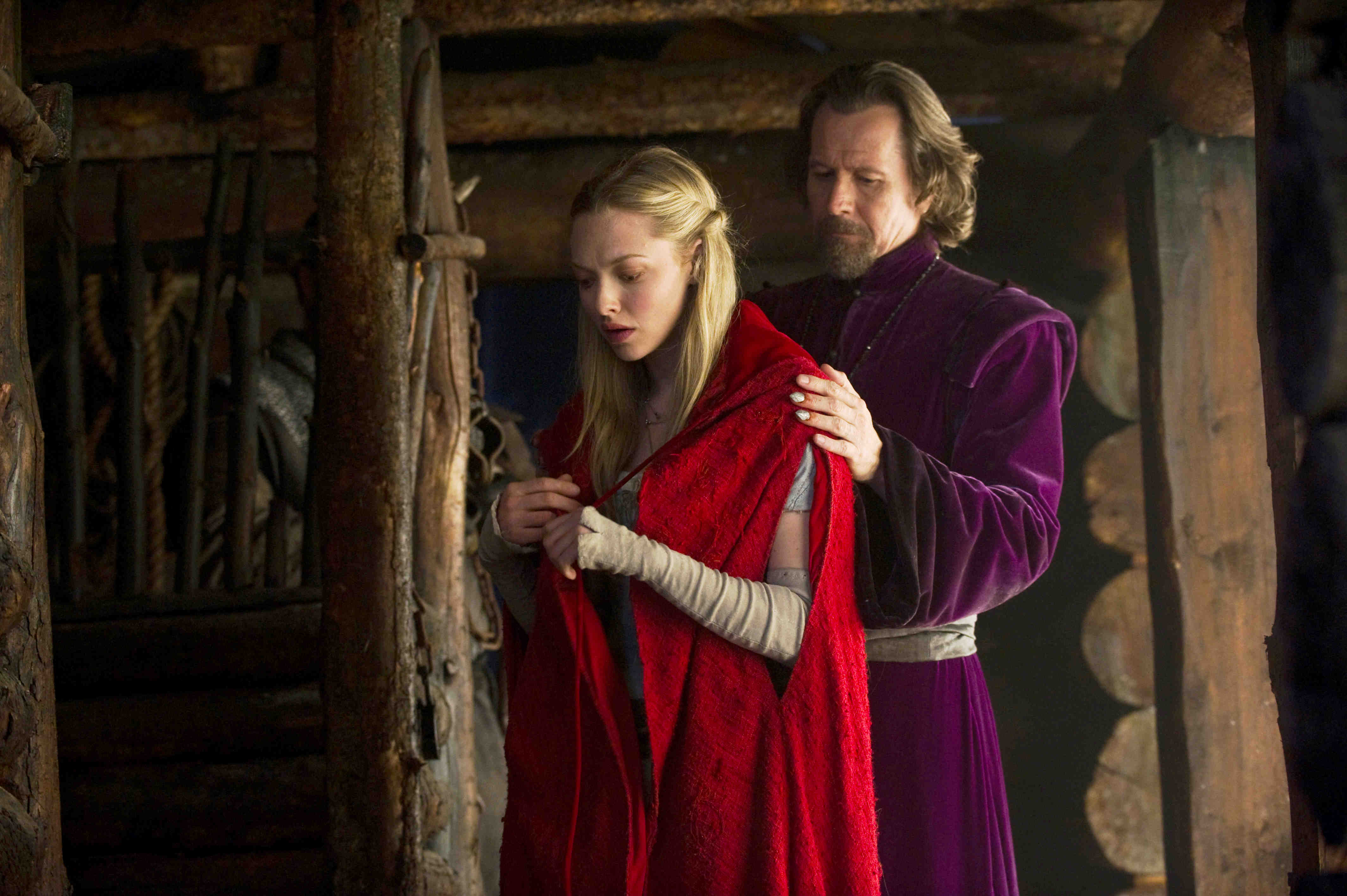 Donc la soeur de la jeune fille à la cape rouge meurt, tuée par un loup. Les villageois organisent une battue et tuent un loup lambda mais un chasseur de loup joué par Gary Oldman vient et dit « bouh, ah, c’est pas un loup, c’est un loup garou et vous allez tous crever, ahah ! Il est caché parmi vous. Ma femme, dont je trimballe le cadavre que j’expose sous vos yeux, était elle même un loup garou et je l’ai tuée, couic ! ». Sur ce, les Villageois organisent une fête, ça flirte avec l’orgie, la jeune fille (Valérie) est à deux doigts de se faire déflorer par le type au gel alors que sa mère vient de gentiment la maquer avec l’ex de sa soeur décédée (mais qui était en fait le demi frère de celle-ci parce que la mère a un peu fauté avec le père du fiancé. Compliqué). Mais bon, pas de déflorage car le loup attaque, il coince la Valoche dans un coin et lui parle (oui oui) en lui disant qu’il fera d’elle un loup garou à la fin de la lune rouge dans 3 jours. Comme elle a noté qu’il avait les yeux marrons, elle a peur de tous les yeux marrons qui traînent. Dont le mec au gel et sa mamie. Ouuuhh…