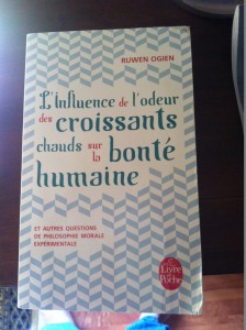 Je me pique parfois de philosophie, comme ça, pour le plaisir. Ainsi, j’aime errer dans les rayons dédiés de la FNAC, laissant mes yeux glisser sur les couvertures en quête d’un ouvrage qui me ravirait les neurones. C’est ainsi qu’en mai ou juin (peu importe), je tombe sur un livre au titre étrange “l’influence de l’odeur des croissants chauds sur la bonté humaine”. Etant dans une recherche perpétuelle de bonté humaine, je le pousse dans mon panier.