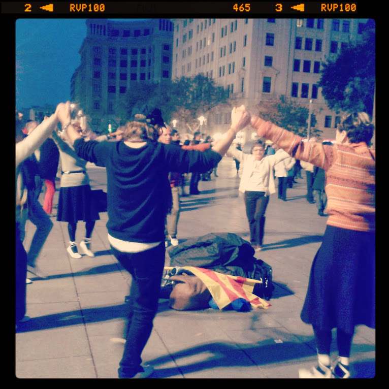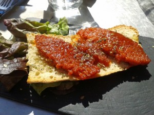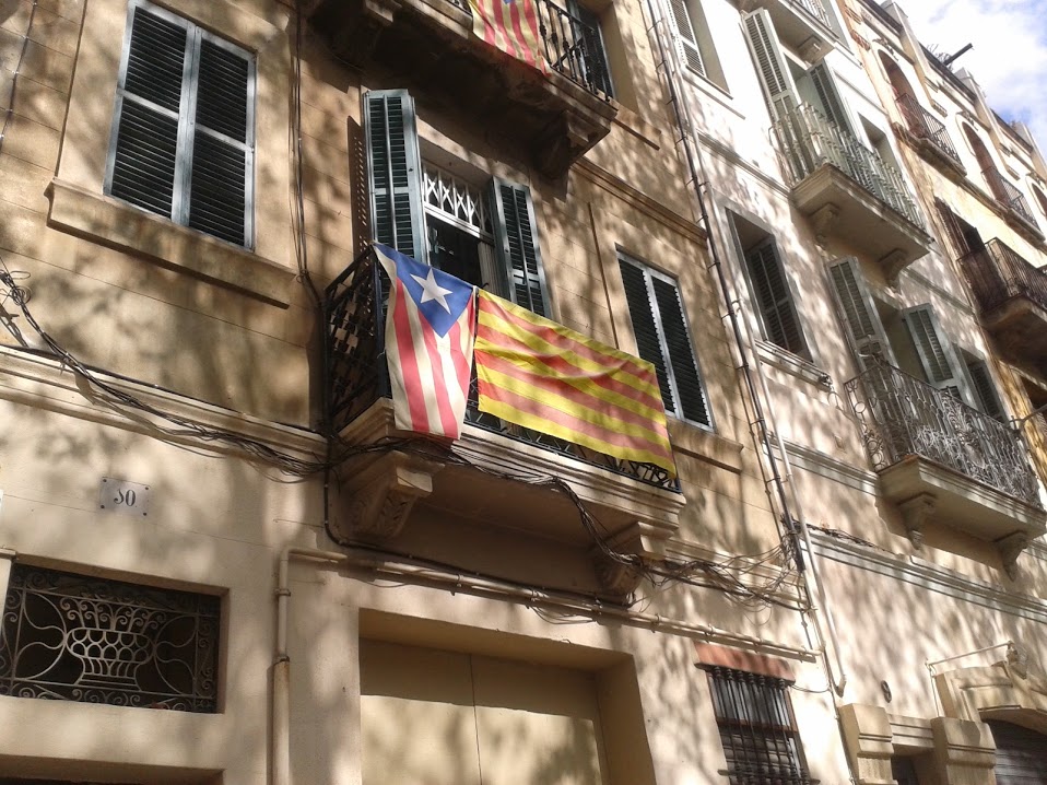 Après une heure et quelques de coma dans un avion de la vueling (j’ai réussi à m’endormir avant le décollage), nous voici donc à Barcelone, je suis excitée comme une puce. Bus, métro, nous voici à Gracia, au nord de la ville. Point histoire : ce quartier était, à l’origine, un village qui a été avalé par l’expansion de Barcelone. Le quartier a conservé son côté village avec plein de petites placettes. Les drapeaux catalans fleurissent aux fenêtres, on va déjeuner à 13h, heure où personne ne mange car il est trop tôt.