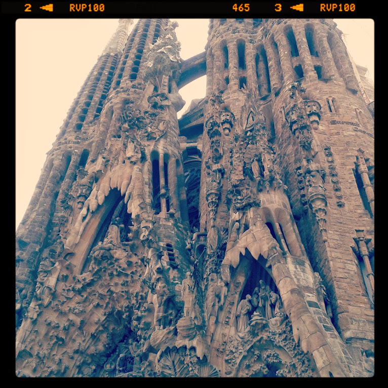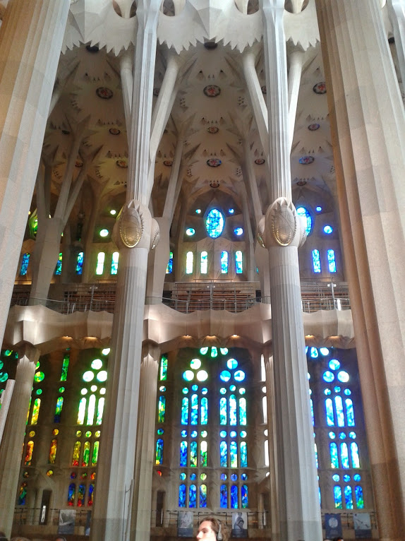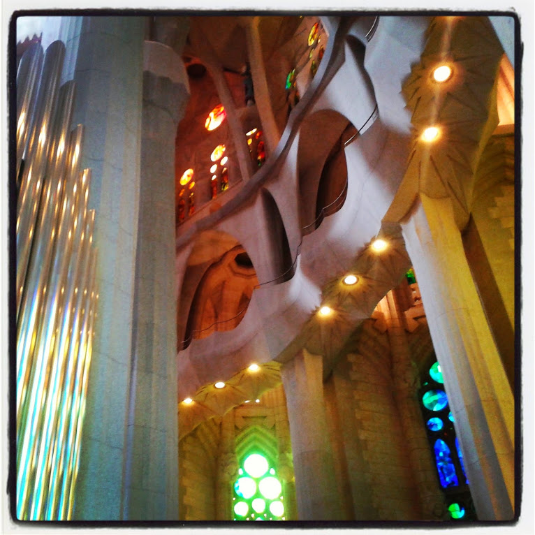 La sagrada familia, donc. Il y a deux faces très distinctes, la nativité, très, TRES riche et la passion, limite un peu flippante, le début et la fin de la vie du Christ en somme. Au milieu, une étrange basilique aux sublimes vitraux, à l’atmosphère très festive avec toutes ces couleurs qui rebondissent sur les surfaces blanches, des colonnes pensées comme des troncs d’arbres. Selon les endroits où l’on évolue, le style change radicalement comme le cloître qui passe presque pour « classique », l’austère façade de la Passion oppposée à la luxuriance de celle de la Nativité… Initiée par Gaudì, elle est toujours en construction. Je sais pas si vous vous rendez compte mais on assiste à la construction d’une gigantesque basilique débutée alors que nos grands-parents n’étaient même pas nés et qui s’achevera sans doute sur nos vieux jours (j’ai lu une estimation à 2026, j’y crois pas trente secondes). Bref, je suis enchantée… mais aussi épuisée. Il faut le savoir, en Catalogne, ça souffle et pas qu’un peu (foi de la fille qui a passé tous ses étés d’enfance en Catalogne) donc on ressort de là saoulées d’air, épuisées.