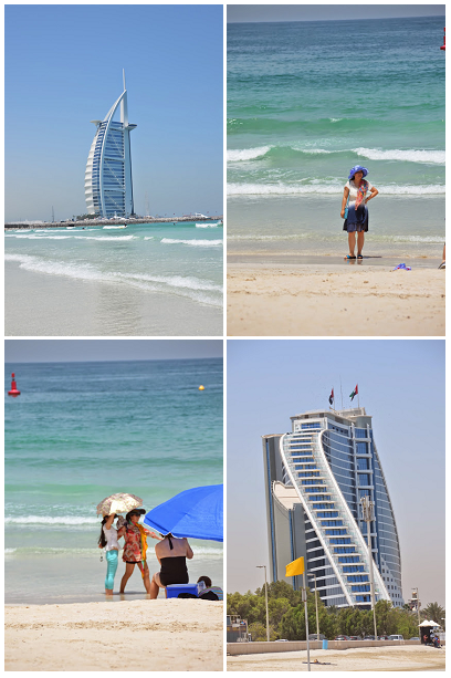 On remonte dans le bus à l’assaut du Dubaï moderne. A partir de là, on n’a plus vu une seule femme voilée. On s’arrête à la plage au pied de l’hôtel « Voile » qu’on reconnaît très bien du ciel (je l’avais vu en allant aux Maldives). Environ 15 000 la nuit, ça gère. Evidemment, nous nous sommes contentés de la plage, on n’allait pas amener les prolos là dedans mais c’est déjà sympa de fouler le sable. Des Asiatiques courts vêtus munis d’ombrelles se prennent en photo… On devrait pas remettre les ombrelles à la mode ? Je trouve ça charmant.
