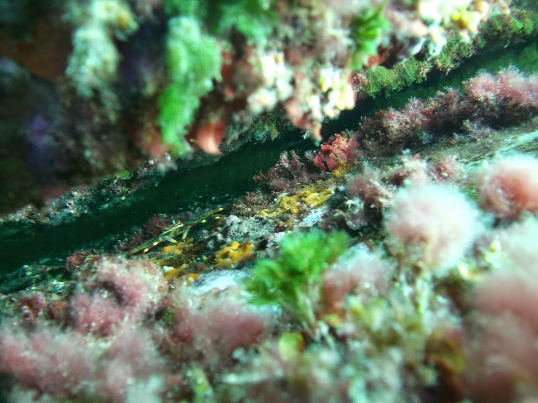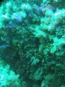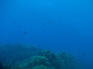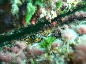 Première plongée, la température de l’eau est plutôt douce… ce qui est plutôt une bonne nouvelle vu qu’on plonge en shorty. Petite parenthèse sur le sujet : ceux qui n’ont jamais plongé ne se rendent pas compte à quel point enfiler une combinaison est franchement pète-couille, surtout les longues. Pour ma part, j’ai toujours quelques soucis à tout faire rentrer, surtout au niveau poitrine/épaules. Là, je n’avais pas pris ma combi car je l’ai cassée à Oman et pas réparée donc shorty. Le shorty, lui, est un bonheur à mettre, beaucoup plus simple, c’est plié en 1 mn. Bref, je pourrais, je ne plongerais que en shorty mais même dans les eaux les plus chaudes, on n’est jamais à l’abri d’une thermocline bien froide et bien vicieuse. Fin du chapitre shorty. Donc eau chaude et visibilité plutôt pas mal mais… peu de poissons.