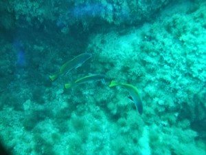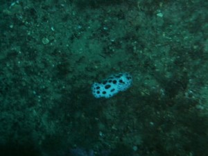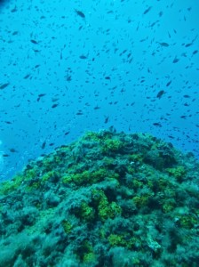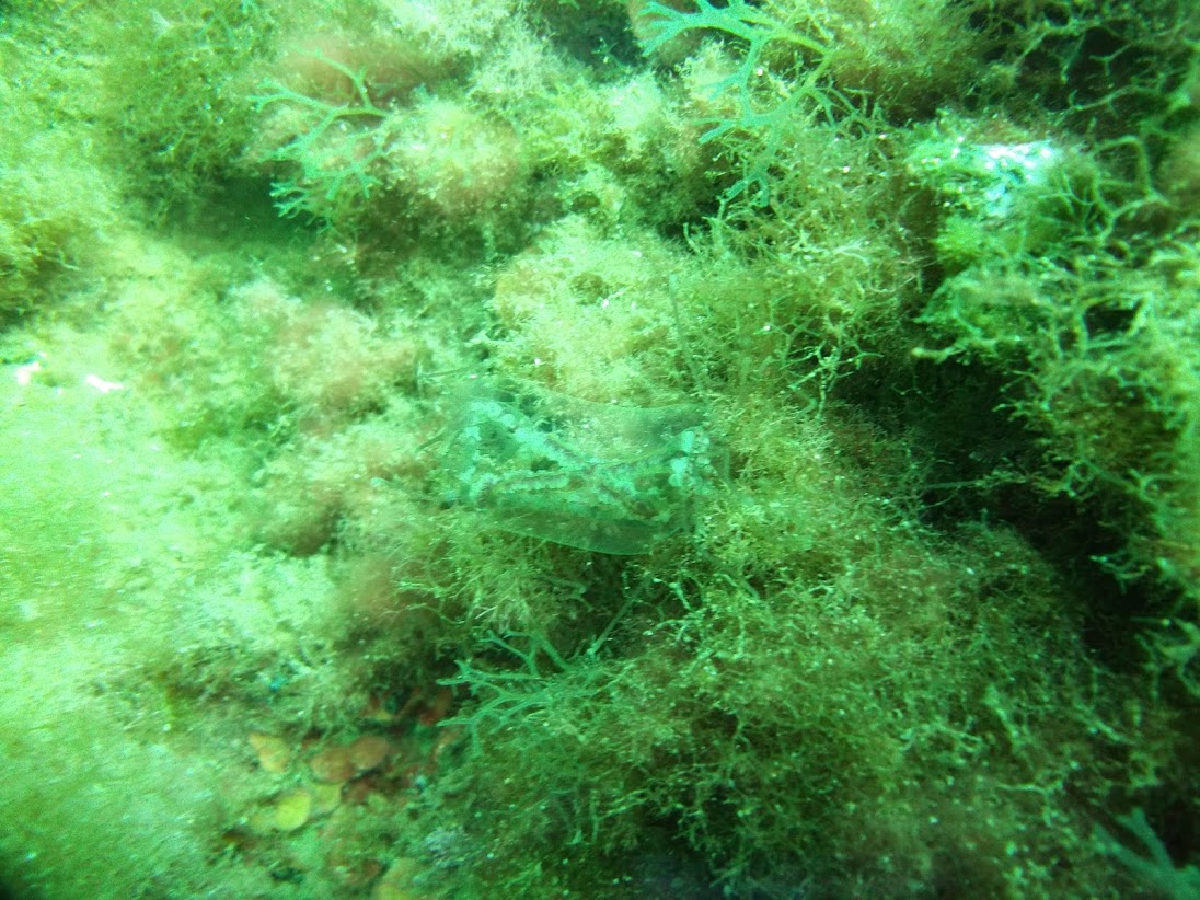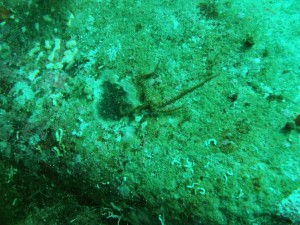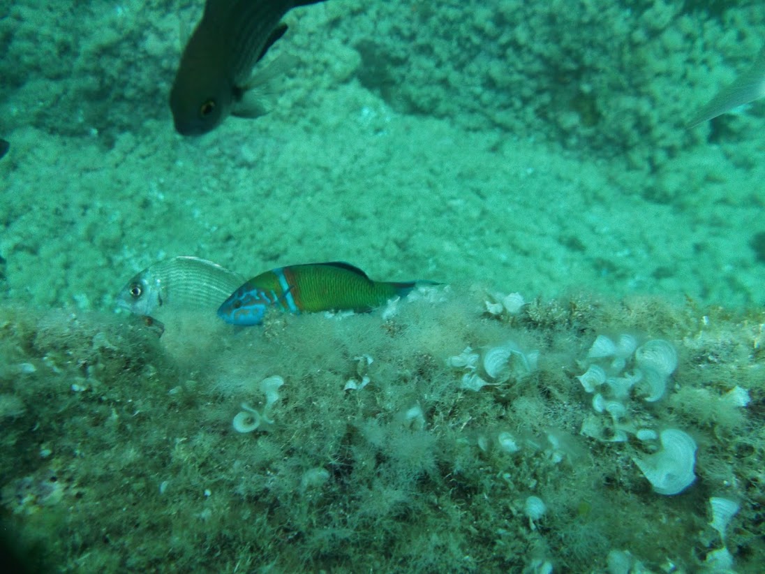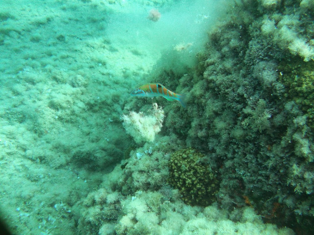 Il faut savoir qu’en Tunisie, ça pêche et braconne pas mal donc ne reste plus beaucoup de poissons : quelques mérous, des poulpes que notre encadrant a fait cracher (pas bien), des seiches, des castagnoles, des girelles paons, murènes, une rascasse, quelques sars et saupes, des étoiles de mer, des araignées de mer que j’étais la seule à voir et une petite raie sous un rocher mais je me demande si elle était pas un peu morte. Pendant une plongée, nous avons d’ailleurs trouvé un chasseur en pleine action. Nous étions à 10-15 m (je sais pas, j’ai cassé mon ordinateur dès la 2e plongée, je suis un boulet) quand je vois notre encadrant piquer un sprint tout à coup, je vois soudain un plongeur en tenue camouflage nous tourner le dos. Hein quoi ? Le dit plongeur se tourne très lentement et j’ai soudain une angoisse : il serait pas un peu mort, celui-là ? Non, il s’agissait juste d’un mec en train de chasser au harpon en apnée, mon encadrant l’engueule et le mec part sans demander son reste (enfin, part, son bateau était toujours là quand nous avons quitté le site).