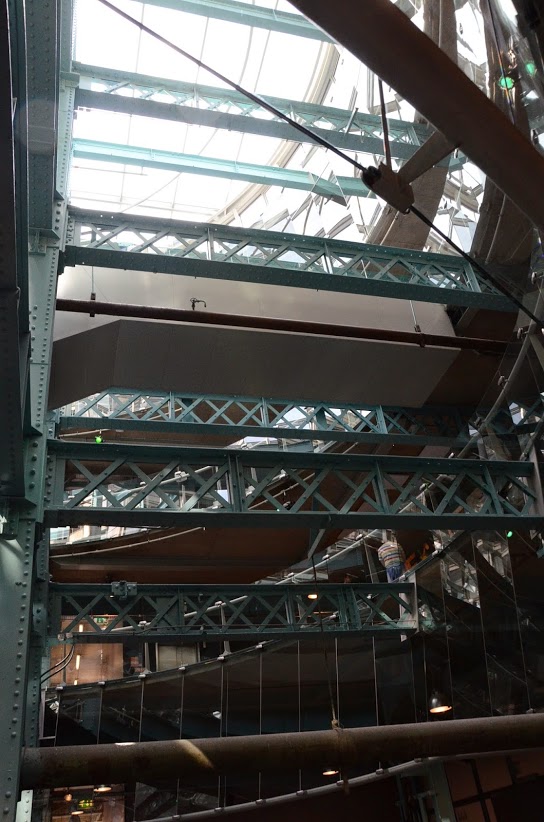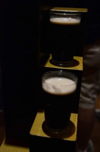 Aucun rapport. Dans la mesure où il nous était un peu compliqué de reprendre l’avion le dimanche soir, quitte à prendre notre lundi, autant profiter pour errer un peu dans Dublin. Et comme nous n’avions pas eu le temps la dernière fois de visiter les deux célèbres fabriques locales, on s’est dit qu’on allait se rattraper avec la fabrique Guinness. Avant de pousuivre, je rappelle que je déteste la bière. On débute par une mise en scène des ingrédients avec une bien jolie chute d’eau puis, au fur et à mesure des étages, on progresse dans la fabrication de la boisson. Ecrans pour nous expliquer le mélange, la fabrication d’un fût… Notre audioguide (gratuit) à l’oreille, on se balade à travers les 6 étages de l’installation. Passage vers le bar sensoriel, on renifle des vapeurs parfumées aux ingrédients de la Guinness. Ah oui, je déteste à peu près autant l’odeur que le goût de la bière en fait. Petit passage dégustation, je tente de me forcer parce qu’on ne sait jamais (j’ai goûté toues les bières prises par mes copines durant le week-end et même les plus douces m’ont faite grimacer mais j’ai une sorte d’étrange foi dans l’évolution de mes goûts)… et j’abandonne discretos mon mini gobelet dans un coin.