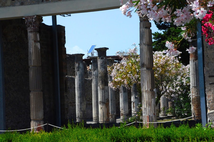 Ce qui est fantastique à Pompéi, c’est vraiment cette facilité à flâner. On est allés un peu au hasard, se perdant pas mal, tombant de ci de là sur un temple, une belle maison aux fresques murales, un charmant jardin, des lauriers fuschia magnifiques. C’est une expérience assez incroyable de pouvoir se promener dans cette ville antique, de fouler les mêmes pavés que les romains, retrouver quelques signes des tuyaux de l’époque, nous rappelant un peu Bulla Regia (l’histoire est somme toute assez similaire). Et puis, en sortant le plan de notre poche, retrouver le forum, l’amphithéâtre ou les arènes.