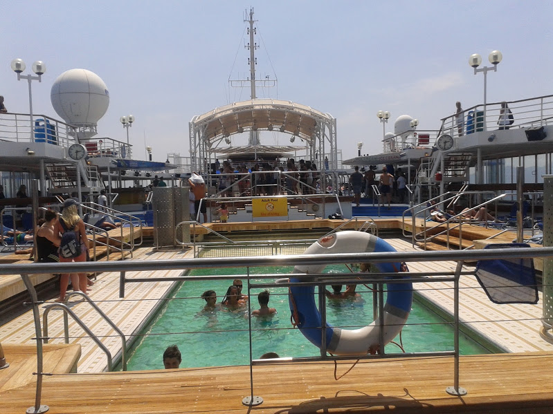Vendredi 10 juillet, on embarque donc sur le Celestya Olympia, un magnifique paquebot qui s’étend sur 9 niveaux avec des restos, des bars, un casino, deux piscines, salle de sport et tutti quanti. On n’est pas montés qu’on nous prend nos passeports et qu’on nous les rendra à l’arrivée puis on arrête pas de nous prendre en photo alors qu’on est légèrement rouges et échevelés (le Pirée, c’est TRES grand). A peine met-on le pied sur le bateau qu’on nous annonce l’exercice d’évacuation, prenez vos gilets et montez niveau 7. Aaaaaah, laissez-nous respirer ! Néanmoins obéissants, on jette nos sacs, prenons nos gilets (je mets évidemment le mien à l’envers), on nous prend encore en photo et on écoute les instructions en 5 ou 6 langues. Des tas de gens se prennent en selfie, Victor et moi sommes un peu atterrés. Mais qui veut se prendre en photo avec un gilet de sauvetage ? « Hihi, on s’entraîne pour si on coule ! #cruise #drama #titanic #