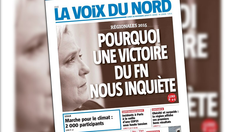 Pourtant, on s’était mobilisés. On a diffusé, on a retweeté, partagé la moindre info anti FN, applaudi la Voix du Nord, dénoncé les dangers que représente le FN pour le droit des femmes, souligné tous les propos border voire franchement racistes des fantoches du Parti, on s’est gaussé de Ménard et Collard (c’est marrant, les deux riment avec…). C’est en voyant la Une de la Voix du Nord que j’ai commencé à sentir un truc, diffus…